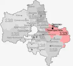 The Orekhovo-Zuyevo constituency (No.123[a]) is a Russian legislative constituency in Moscow Oblast. The constituency covers north-eastern Moscow Oblast, including Elektrogorsk, Elektrostal, Orekhovo-Zuyevo and Roshal.
