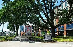 The area immediately north of the station, among the last parcels of land to be filled, was approved for development in 2013.[28][29] The $120 million Platform District, developed by Holland Partners Group, features three six-story, mixed-use buildings that include more than 1,000 housing units and 20,000 square feet (1,858 m2) of retail space. The first of the three buildings, called "The Hub", was completed in February 2015.[30] At the district's center is Plaza Park, a 0.5-acre (0.2 ha) urban plaza that consists of a water feature, a colorful pergola, and a raised deck built around two white oak trees. The plaza is designed to host outdoor public events.[31][32]
