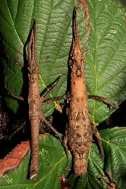 - ^ a b Bank, S.; Buckley, T. R.; Büscher, T. H.; Bresseel, J.; Constant, J.; de Haan, M.; Dittmar, D.; Dräger, H.; Kahar, R. S.; Kang, A.; Kneubühler, B.; Langton-Myers, S. & Bradler, S. (2021) Reconstructing the nonadaptive radiation of an ancient lineage of ground-dwelling stick insects (Phasmatodea: Heteropterygidae), Systematic Entomology, DOI: 10.1111/syen.12472