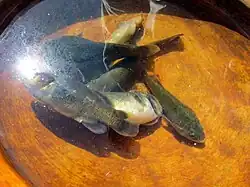 Despite their moderate to small size, some species are important to local fisheries, but they are overfished, there are few regulations and limited enforcement of the rules that do exist.[14][16] In Lake Titicaca, the moderately sized O. agassizii and O. luteus (complexes) represent more than 90% of the total catches of native fish species,[7] but others like the small open-water ispi (O. forgeti and O. ispi) are also frequently caught.[20] The natives have now been greatly surpassed by fisheries for the non-native introduced trout and Argentinian silverside.[14] Because of pollution, studies have revealed levels of metals in Orestias of Lake Titicaca that exceed the internationally recommended safety thresholds for human consumption.[21] O. agassizii and O. luteus are also farmed and spawned in captivity; both to supply the food market and for release to support their vulnerable wild populations.[7][22]