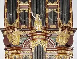 The relatively broad cases of the Hauptwerk and Rückpositiv are both divided into five parts and are matching in shape. In both cases, the elevated polygonal central tower is connected to the lateral pointed towers by two-storey pipe-flats in which dummy pipes are used (as in the Schnitger organ in Nieuw Scheemda). The pointed side towers and flats of the two cases are respectively united under a common cornice in composite style. Elaborately designed mechanisms connect to the narrower lower case with the console.[7] The richly decorated cornices, stands and friezes of the facade echo the appearance of the previous instrument, or perhaps parts of the old ornamentation were re-used.[8] The new carving was created by the Hamburg sculptor Christian Precht.[9] The detail of the pipe-shades features floral elements exclusively in the main case, but the Rückpositiv adds flowers, fruits, grimaces, stylized animal heads and – in the lower part of the Rückpositiv – three angel heads.[10]