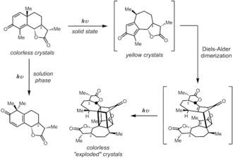 Early examples were often uncovered by the observation of precipitates or color changes from samples that were exposed to sunlights. The first reported case was by Ciamician that sunlight converted santonin to a yellow photoproduct:[3]