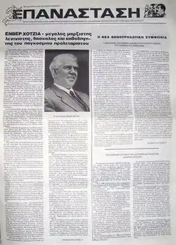 The organization published a monthly newspaper called Epanastasi (Greek: Επανάσταση, Revolution).