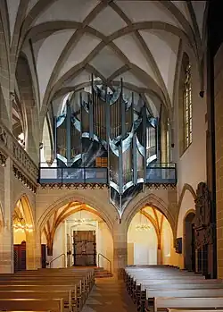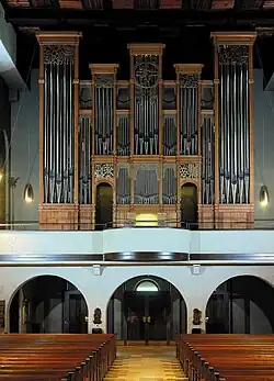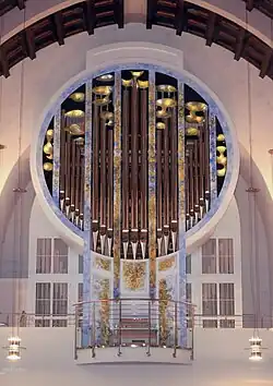 Developments during the 1990s included the restoration of several important concert hall organs: Görlitz Stadthalle (1910 Sauer organ; 1991; 4/71); Heidelber Stadthalle (4/56); and Prague, Smetana-Saal (1912 Voit und Söhne, 1995–96; 3/70). The construction of large instruments in a late-nineteenth-century style was also completed at Aschaffenburg, Herz-Jesu Kirche (1995; 4/63); Munich, Bürgersaalkirche (1994; 3/50); Kitzingen, Stadtpfarrkirche St. Johannes (1996; 3/54); and Jülich, Probsteikirche (1998; 3/45). The Jülich organ contains accessories including thunder rolls, rain machine, and a croaking bullfrog. Vleugels also built new organs in the South German style in historic cases at Würzburg, Käppele (1991; 2/31) and Schäftlarn Benediktinerabtei (1996; 2/31). There were new directions in constructing cases using special materials - a glass case for the Christopherus-Kapelle of the Franz-Josef-Strauss airport in Munich (1/6) - and dramatic artistic effects with contemporary painting as in Kitzingen, Stadtpfarrkirche St. Johannes (1996; 3/54) and Runding, St. Andreas (1998, 2/36). Finally the 1990s saw the restoration of several historic organs in Germany: Gaibach, Heilig-Kreuz-Kapelle (1699 Schleich organ; 1989–90; 1/7); Gaibach, Pfarrkirche (1748 Seuffert organm 1997; 1/12); Mainz Budenheim (1747 Kohlhaas organ); and Laumersheim in der Pfalz (1717 Hoffmann organ).[1]