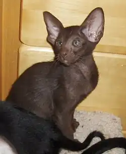 Orientals typically have large ears and green eyes (Solid chocolate Oriental kitten)