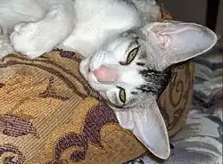 The Oriental Shorthair is a breed of domestic cat that is developed from and closely related to the Siamese cat. It maintains the modern Siamese head and body type but appears in a wide range of coat colors and patterns. Like the Siamese, Orientals have almond-shaped eyes, a triangular head shape, large ears, and an elongated, slender, and muscular body. Their personalities are also very similar. Orientals are social, intelligent, and many are rather vocal. They often remain playful into adulthood, with many enjoying playing fetch. Despite their slender appearance, they are athletic and can leap into high places. They prefer to live in pairs or groups and also seek human interaction. Unlike the breed's blue-eyed forebear, Orientals are usually green-eyed.[1] The Oriental Longhair differs only with respect to coat length.