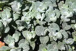 Origanum dictamnus is a many branched plant with discoid to ovate, grey-green leaves that are sited in pairs opposite each other. The slender arching stems and lanate leaves are covered in a velvety white down and are 13–25 mm in size.