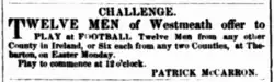 Advertisement that appeared in the South Australian Register on 22 March 1853 paid for by Irishmen from County Westmeath calling for fellow Irishmen in Adelaide to join them in playing a form of football in Thebarton.[4]