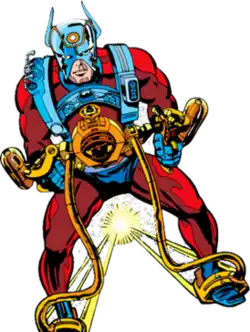Orion belongs to an extraterrestrial race of supernatural immortals known as the New Gods. As a New God, he possesses the standard superhuman attributes of strength, speed, stamina and durability on par with his father Darkseid as well as with Superman; being virtually indestructible, able to run at supersonic speeds up to orbital speed, and lift weights exceeding 100 tons.[26] Although he is a highly skilled warrior, noted for a fierce warrior's instinct,[27] his great rage and inner turmoil makes him impulsive and prone to violent, almost psychotic outbursts as he has inherited much of his father's darkness.[28] He has access to a Mother Box that can calm his temper and change his appearance, "smoothing" out his coarse features.[27] In addition, Orion possesses a regenerative healing factor, and is able to call upon his Mother Box to assist in healing injuries or to sustain his life energies. Like all other New Gods, Orion is vulnerable to a substance called Radion. The "Astro-Harness" is an alien artifact of unknown origin, capable of self-repair; flight at light speed;[28] interstellar teleportation;[27] energy projection and absorption; force field generation; and possesses a tractor beam. Orion's wristbands are virtually indestructible.[29]