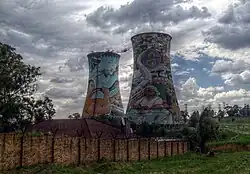 The two cooling towers are a prominent landmark in Soweto. They were built in 1951 to supplement the spray pond cooling system as this source of cooling was running at its capacity.[1]