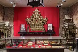 Built in 1868, the Council Room houses a beautiful hanging screen of carved wood with gold leaf overlay. Also in the room are two procession shrines which were carried in parades during Chinese festivals. The room was used primarily for business transactions. Since there were few literate Chinese in Oroville in the latter 19th century, It is surmised that the few learned Chinese men in Oroville at the time assisted others in recording their transactions.