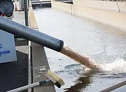 About 150,000 cubic yards (110,000 m3)[33] of erosion debris clogged the channel of the Feather River below the dam, preventing release of water from the hydroelectric plant, thus reducing the overall capacity of the dam to release water.[20] Debris was carried downstream and caused damage to the Feather River Fish Hatchery due to high turbidity.[34] State workers began evacuating fish and eggs from the hatchery in an attempt to mitigate the damage and evacuated over nine million fish downstream to a satellite hatchery adjacent to Thermalito Afterbay.[35][36]