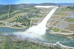 Shortly after 8:00 am on February 11, 2017, the emergency spillway began carrying water for the first time since the dam's construction in 1968.[23] Because the spillway was a separate structure from the dam, officials stated that there was no danger of the main embankment being breached, and evacuation of Oroville was not considered at that time, as officials stated that there was no threat to public safety. The uncontrolled flow over the weir topped out at 12,600 cu ft/s (360 m3/s).[24][25]