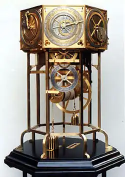 There is an orrery built by clock makers George Graham and Thomas Tompion dated c. 1710 in the History of Science Museum, Oxford.[17] Graham gave the first model, or its design, to the celebrated instrument maker John Rowley of London to make a copy for Prince Eugene of Savoy. Rowley was commissioned to make another copy for his patron Charles Boyle, 4th Earl of Orrery, from which the device took its name in English.[18][19] This model was presented to Charles' son John, later the 5th Earl of Cork and 5th Earl of Orrery. Independently, Christiaan Huygens published in 1703 details of a heliocentric planetary machine which he had built while living in Paris between 1665 and 1681. He calculated the gear trains needed to represent a year of 365.242 days, and used that to produce the cycles of the principal planets.[13]