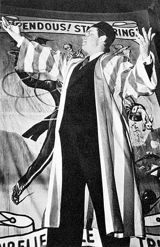 The Mercury Theatre opened November 11, 1937, with Caesar, Welles's modern-dress adaptation of Shakespeare's Julius Caesar—streamlined into an anti-fascist tour de force that Joseph Cotten later described as "so vigorous, so contemporary that it set Broadway on its ear".[53]: 108 The set was completely open with no curtain, and the brick stage wall was painted dark red. Scene changes were achieved by lighting alone.[56]: 165 On the stage was a series of risers; squares were cut into one at intervals and lights, designed by Jean Rosenthal, were set beneath it, pointing straight up to evoke the "cathedral of light" at the Nuremberg Rallies.[57] "He staged it like a political melodrama that happened the night before," said Lloyd.[55]