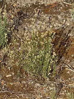 It is a ± glaucous plant, with a woody stalk. Stems up to 30(60) cm high, junciform, erect -rarely spreading-, strongly branched from the base, with rigid, angular branches, often strongly scabridged at the top. Leaves from 5-15(20) x 1-2 mm, shorter than internodes, sessile, entire, achillate, glabrous, often scabrous at margin; scarious stipules, almost setose, swollen basally in a persistent gland, purplish. Flower bracts scarious, linear-lanceolate, with scabrious margin and keel and 2 small purple glands at base. Sepals are 2-2.5(3) mm, ovate-lanceolate, ± acute, keeled and scarious on the keel, greenish, broadly margined scarious, usually sublacinate. Seeds are small, fusiform, honeyed.[6][7]