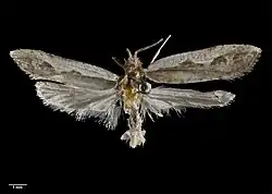 ♂. 14 mm. Head and thorax greyish brown, tegulae purplish. Palpi grey mixed with brown. Antennae brown annulated with white. Abdomen ochreous grey. Legs purplish brown mixed with whitish. Forewings with costa moderately arched, apex blunt pointed, termen hardly rounded, oblique; purplish fuscous, upper half of wing white, clear basally and becoming progressively more tinged with purplish fuscous after ½; extreme edge of costa purplish fuscous near base; a triangular projection of fuscous half into upper portion at ⅓ and a similar but larger projection at ⅔: fringes purplish fuscous. Hindwings subtrapezoidal; greyish white, purplish-tinged towards termen: fringes ochreous white.[2]