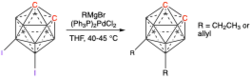 Iodinated derivatives of carborane can be further modified to access boron alkylated products via a cross coupling reaction. This can be done by treating the halogenated carborane with a Grignard reagent in the presence of a phosphine palladium complex. The bromo and chloro compounds do not react under the same conditions.[15]