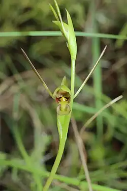Orthoceras novae-zeelandiae,[1] commonly known as the New Zealand horned orchid,[2] is a species of orchid native to New Zealand. In Māori it is called hūperei or perei.[3][4]