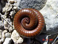 Orthoporus ornatus (also known as the desert millipede) is a North American species of millipede in the family Spirostreptidae that can be found in the U.S. states of Arizona, New Mexico and Texas, and as far south as the Mexican state of San Luis Potosí. They became very popular in the pet trade and many were exported to Western Europe. Brian Van Der Kieft and Max Prins were the first breeders of this species in Europe.[1] Individuals on average are 4 inches (10 cm) in length,[2] but can either be as small as 3 inches (76 mm),[3] or exceed up to 9 inches (230 mm) in length. They are dark brownish coloured,[4] but can sometimes be yellow. In fact, in every state the species look different.[5] The antennae are located near the organs of Tömösváry. The species feed on both living and dead organic material. The species prefer sunshine, but can be seen on summer rainy days as well. A disturbed Orthoporus ornatus may curl into a coil and release a toxic substance that is located on all sides of its body. The species can live more than ten years.[6] The species feed on shrubs of Ephedra, which grows in Jornada del Muerto, and on Salsola that grows in Albuquerque.[7]