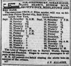 Beginning in 1842 Orus made one round trip a day between the Fulton Market wharf[4] in lower Manhattan and Red Bank, New Jersey. She stopped at Shrewsbury, Long Branch, Ocean House, Port Washington, and Middletown.[5] The fare was 50 cents in 1843, but was raised to $1 in 1844.[6][7] Orus spent much of her time during her New Jersey service under the command of Captain John Edward Allaire, J. P. Allaire's nephew.[8] Stage coach lines were synchronized with Orus' schedule to carry passengers between Red Bank and Upper Squankum (now Farmingdale), Freehold, and the Howell Works.[9][10]