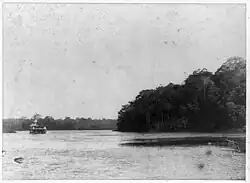 Orus was less useful as a river steamer than hoped. It was variously reported that even with her relatively shallow draft, she was unable to ascend more than fifteen or twenty miles up the Charges River. She was unable to reach Gorgona. In order to reduce her draft, Orus placed some of her passengers and freight in canoes and towed them up the river.[21][22] Further, the tree canopy arched over the river in some spots forming a continuous roof that Orus' funnel was too tall to pass under. The charge for passage on Orus up the river was $10 per person.[23]