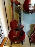 Gibson began in 1894 in his home workshop in Kalamazoo, Michigan, and patented his idea for mandolins in 1898.[5] With no formal training, Gibson created an entirely new style of mandolin and guitar that followed violin design, with its curved top and bottom carved into shape, rather than pressed or bent, arched like the top of a violin.[6] He applied for and was granted a patent on the design.[7] The sides too were carved out of a single block of wood, rather than being made of bent wood strips.[5] More importantly, they were louder and more durable than contemporary fretted instruments, and musicians soon demanded more than he was able to build in his one-man shop.