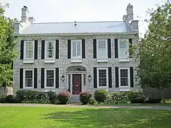 In 1823, Orville Hungerford began to construct the largest house in Watertown on a piece of property that he purchased in 1816 for $500.00 from Olney and Eliza Pearce.[81] In front was a "glorious" English garden laid out to Orville's specifications.[82] The outer walls of the home were made out of native limestone. The inside had 14 bedrooms and 10 fireplaces to keep the occupants warm.[83] An ox team hauled the "black Italian marble mantel" from Albany.[82] Construction on the main house continued through 1824.[84] On November 11, 1825, Orville opened the six-paneled door with a brass eagle-knocker at 336 Washington Street and moved into his mansion.
