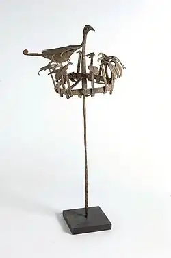 The birds on Osanyin staffs suggest an iconographic link with the birds on Obas' crowns.[4]