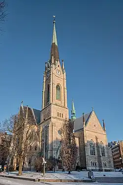 Oscar's Church (Swedish: Oscarskyrkan) is one of the major churches in Stockholm, Sweden.[1] The three-aisled hall church, which holds 1,200 people, has an 80-metre-high (260 ft) tower in the south-western part of the building. Oscar's Church is located in the south-eastern part of Östermalm, where Storgatan and Narvavägen meet, near the Swedish History Museum. Narvavägen is together with the nearby Strandvägen—from which the church is also visible—one of the city's main boulevards, lined with several residential palaces.[2]