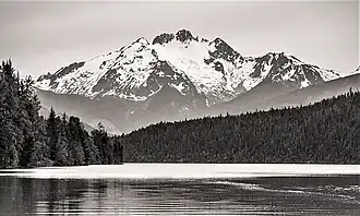 Oscar Peak is part of the Kitimat Ranges of the Coast Mountains.[1] It is situated 55 km (34 mi) north-northwest of Terrace and 35 km (22 mi) south-southwest of Mount Priestley, the nearest higher peak.[1] Precipitation runoff and glacial meltwater from the northern slope drains to headwaters of Ksi Sii Aks (formerly Tseax River), and the south side of the peak drains into tributaries of the Cedar River. Oscar Peak is more notable for its steep rise above local terrain than for its absolute elevation. Topographic relief is significant as the summit rises 1,300 meters (4,265 feet) above Hadenschild Creek in 2 kilometers (1.2 miles). This prominent mountain is visible from southbound on the Nisga'a Highway (Highway 113) at Lava Lake.