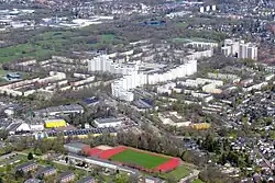 Osdorfer Born was often described as "deprived area" or "social hotspot" (German: "sozialer Brennpunkt"). The proportion of welfare recipients and migrants is each about 20 percent, unemployment was rising during the 2000s.[3] On the other hand, the district authorities recently adopted several measures to improve the quality of living and the social environment.[4]