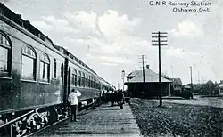 The Grand Trunk Railway between Montreal and Toronto was completed in 1856[2] and the first Oshawa station was where Albert Street met the GTR tracks.[3] In 1923, the Grand Trunk was absorbed by the Canadian National Railway (CN) who, in the 1960s, built a single-floor station with a flat roof west of the original station where the CN yard is now on the north side of the tracks. The building was expanded and upgraded by Via Rail in the early 1990s and GO Transit's Lakeshore East line was extended to there in 1995.