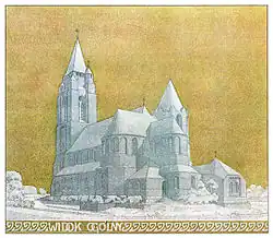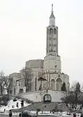 All this then led to Sosnowski’s magnum opus of the late 1920s, the Białystok Church (St. Roch's Church in Białystok).[16] It has sometimes been compared to the work of the pioneer of reinforced concrete, Auguste Perret; but Sosnowski’s spatial imagination and his judicious use of crystalline Art Déco motifs go far beyond anything one may find in the work of the French master. In a similar way one may draw again comparisons with German avant-garde design. One is reminded of the revolutionary drawings of the immediate post war years, by Wassili Luckhardt or Bruno Taut, but one would look in vain for a realisation of these dreams in Germany, in a manner that is both as daring and as controlled as Sosnowski’s church. Naturally, the medium-sized town of Białystok could not afford the vast building of the kind which appeared in the architect’s painted dreams of the same years, but Sosnowski maximised the effect of the church on a hill as a Stadtkrone – which is naturally something that can only be experienced on the spot. The quality of the interior space might be summarised by the way one can see it, almost simultaneously, as a dense forest of piers and as a continuous soaring of openings covered by the lightest kind of ceilings. From that point one may, finally, look forward to the way in which the mighty Polish Catholic Church took up the task and built, all over the country, its large number of fiercely inventive sanctuaries in the 1970s to 1990s.