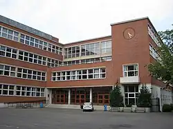 Four-story L-shaped brick building with ranks of white wood-framed windows; a parking lot in foreground. Two four-metre conifers are planted in containers at the front. On the right part of the "L" a wheelchair ramp and broad steps across the width of the building provide access to three double doors. The top two storeys are partially set back from the main façade. On the rightmost part of the building is an oversized modern clock face set into the brick. | |