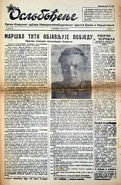 The Oslobođenje (Serbo-Croatian Cyrillic: Ослобођење; Bosnian pronunciation: [oslobod͡ʑěːɲe]; 'Liberation') is the Bosnian national daily newspaper, published in Sarajevo. It is the oldest daily newspaper still in circulation in the Bosnia and Herzegovina.[2] Founded on 30 August 1943, in the midst of World War II, on a patch of territory liberated by Partisans, in what was otherwise a German-occupied country, the paper gained recognition over the years for its high journalistic standards and is recipient of numerous domestic honors and international awards in a branch.[3]
