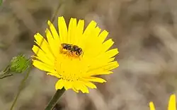 Osmia spinulosa is an oligolectic species specializing in Asteraceae. A preference for certain species is not discernible. Pollen sources are Anthemis tinctoria, Anthemis arvensis, Inula hirta, Inula salicina, Inula ensifolia, Buphthalmum salicifolium, Pulicaria dysenterica, Aster amellus, Senecio jacobaea, Echinops spaerocephalus, Cirsium vulgare, Cirsium arvense, Carduus crisous, Cichorium intybus, Picris hieracioides, Leontodon autumnalis, Hieracium pilosella. Telekia speciosa and Calendula officinalis are also used in the Munich Botanical Garden. Buphthalmum is of great importance as a source of pollen in the limestone mountains. The females do not visit the same flowers all the time; during one flight they regularly visit up to four different asteraceae (e.g. Hieracium / Centaurea / Anthemis / Echinops). The plant species mentioned can also serve as sources of nectar.[3]