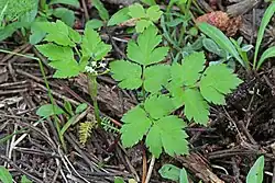 The green leaves have blades up to 12 centimeters wide which are divided into toothed or deeply lobed leaflets. The blade is borne on a long petiole.