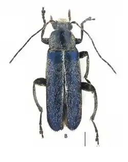 Adults reach a length of about 8.1 mm. The elytra are metallic blue with mixed whitish and blackish recumbent setae.