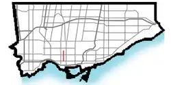 Nomenclature would be confusing until a late 1910s reform. By 1884, a street named "Ossington Avenue" had been constructed, running north from Dundas to Bloor Street,[8] and by 1890, as far as St. Clair[9] (though the section north of Davenport was eventually renamed to Winona Drive, and contemporary Ossington Avenue ends at Davenport). As of 1884, "Dundas Street" is a T-shaped entity comprising the Ossington Strip and contemporary Dundas Street West, west of the Garrison Creek bridge at contemporary Crawford Street. By 1894, the eastern spur of Dundas Street had been renamed, with "Arthur Street" consistently applied to contemporary Dundas Street West eastward from the Ossington Strip.[10] Finally, by 1923, contemporary naming is in place, with the Ossington Strip having been renamed "Ossington Avenue" (continuously with the segment running northward from contemporary Dundas and Ossington) and Arthur Street having been renamed "Dundas Street" (continuously with the segment running eastward from contemporary Dundas and Ossington).[11]