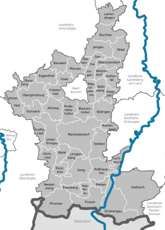 Ostallgäu (German pronunciation: [ˈɔstˌʔalɡɔʏ]) is a Landkreis (district) in Swabia, Bavaria, Germany. It is bounded by (from the west and clockwise) the districts of Oberallgäu, Unterallgäu, Augsburg, Landsberg, Weilheim-Schongau and Garmisch-Partenkirchen, and by the Austrian state of Tyrol. The town of Kaufbeuren is enclosed by but does not belong to the district.