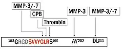 Full-length OPN (OPN-FL) can be modified by thrombin cleavage, which exposes a cryptic sequence, SVVYGLR on the cleaved form of the protein known as OPN-R (Fig. 1). This thrombin-cleaved OPN (OPN-R) exposes an epitope for integrin receptors of α4β1, α9β1, and α9β4.[13][14] These integrin receptors are present on a number of immune cells such as mast cells,[15] neutrophils,[16] and T cells. It is also expressed by monocytes and macrophages.[17] Upon binding these receptors, cells use several signal transduction pathways to elicit immune responses in these cells. OPN-R can be further cleaved by Carboxypeptidase B (CPB) by removal of C-terminal arginine and become OPN-L. The function of OPN-L is largely unknown.