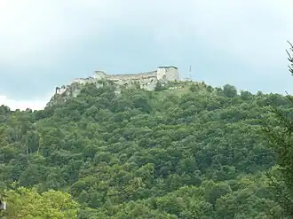 The Ostrovica Castle (Bosnian: Stari grad Ostrovica, Ottoman Turkish: Ostroviçe kalesi) is a large medieval structure situated above the small village of Ostrovica near Kulen Vakuf, Bihać municipality, Bosnia and Herzegovina. Having been built on a heavily wooded ridge of a steep hill overlooking left bank of the shallow Una river, the castle was located on a strategic site connecting the northern and southern parts of the long Una valley.