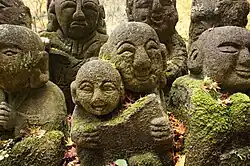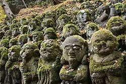 The Otagi Nenbutsu-ji Temple is located on a hillside in the western part of Kyoto in the Arashiyama district. Due to its remote location, the temple is not well known other than to locals.[1] The gate of the temple contains two fierce-looking Nio statues that welcome visitors at the entrance. Inside the temple, there are more than 1200 arhat, stone statues representing the disciples of Buddha. The arhat statues are the main attraction of the temple as they adorn the hillside surrounding the temple buildings.