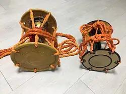 The ōtsuzumi (大鼓), also known as the ōkawa (大皮), is an hourglass-shaped Japanese drum.[1][2] It is a larger version of the tsuzumi, or kotsuzumi, and is used in traditional Japanese theater and folk music.[3] Its appearance is slightly different from that of the tsuzumi, and the sound produced is vastly different from any of the four sounds the kotsuzumi produces.[4] Whereas the kotsuzumi is smaller and has a more ornate drum head, the ōkawa is larger, and its head takes on a more plain, leathery appearance. The sound is also higher and sharper in pitch, resembling more of a dry, almost metallic "crack" than the tsuzumi's softer "pon" sound. The hourglass structure is slightly bigger, and has a prominent protruding "knob" at the middle, unlike that of the kotsuzumi, which has a smoothened-out middle section. The heads of the drum are taut very tightly, leaving no room for further tension, and acoustic, adjustments. The ōkawa is played on the left thigh of the player, possibly due to its larger, heavy size, whereas the tsuzumi is played upon the right shoulder.