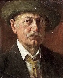 In 1870, he enrolled at the Academy of Fine Arts Vienna, where he studied with Carl Wurzinger, followed by studies at the Academy of Fine Arts, Munich, where he took lessons from Wilhelm von Diez and began producing genre scenes of folk-life. Attempts at painting landscapes en plein-air were not to his liking. For almost twenty years, he stayed in Munich, where he shared a studio with Béla Spányi and sent his paintings to exhibitions in Paris and London as well as Budapest.[1] His works proved to be very popular and he soon became wealthy.