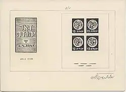 In 2007, several original pieces of Wallish artwork for the Doar Ivri stamp were sold at auction. In one preliminary essay, the stamp is designed as a triangle. Furthermore, in another Wallish essay, the stamps on the first day cover were prepared with the "wrong" name of the state: Yehudah (Hebrew: יהודה, cf. Judah or Judea), as shown here.[8] He had also proposed to put Eretz Yisrael on the stamps, which the provisional government leaders turned down as well. After speaking privately with German stamp dealers, who recommended a Hebrew equivalent to Deutsche Post ("German Mail"), Wallish proposed the phrase Doar Ivri, which was accepted.[3]