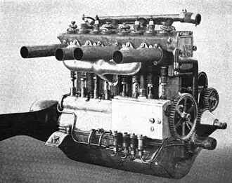 The cylinders were cast separately from iron and then machined. They were grouped together to a single block, joined at their cooling jackets by means of flanges and bolts. There were two side valves per cylinder, which were operated from the camshaft, which was located on the left side of the engine block and driven from the crankshaft by spur gears. All four cylinders were fed by a single carburettor. A single spark plug per cylinder was mounted above the inlet valve, with the magneto located at the control side of the engine, driven from the crankshaft via an intermediate spur gear.