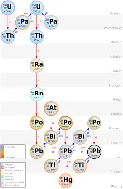 Hahn determined that uranium Z had a half-life of around 6.7 hours (with a two per cent margin of error) and that when uranium X1 decayed, it became uranium X2 about 99.75 per cent of the time, and uranium Z around 0.25 per cent of the time. He found that the proportion of uranium X to uranium Z extracted from several kilograms of uranyl nitrate remained constant over time, strongly indicating that uranium X was the mother of uranium Z. To prove this, Hahn obtained a hundred kilograms of uranyl nitrate; separating the uranium X from it took weeks. He found that the half-life of the parent of uranium Z differed from the known 24-day half-life of uranium X1 by no more than two or three days, but was unable to get a more accurate value. Hahn concluded that uranium Z and uranium X2 were both the same isotope of protactinium (protactinium-234), and they both decayed into uranium II (uranium-234), but with different half-lives.[43][44][46]