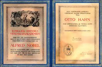 Under Nazi rule, Germans had been forbidden to accept Nobel prizes after the Nobel Peace Prize had been awarded to Carl von Ossietzky in 1936.[125] The Nobel Committee for Chemistry's recommendation was therefore rejected by the Royal Swedish Academy of Sciences in 1944, which also decided to defer the award for one year. When the Academy reconsidered the award in September 1945, the war was over and thus the German boycott had ended. Also, the chemistry committee had now become more cautious, as it was apparent that much research had taken place in the United States in secret, and suggested deferring for another year, but the Academy was swayed by Göran Liljestrand, who argued that it was important for the Academy to assert its independence from the Allies of World War II, and award the prize to a German, as it had done after World War I when it had awarded it to Fritz Haber. Hahn therefore became the sole recipient of the 1944 Nobel Prize for Chemistry.[124]